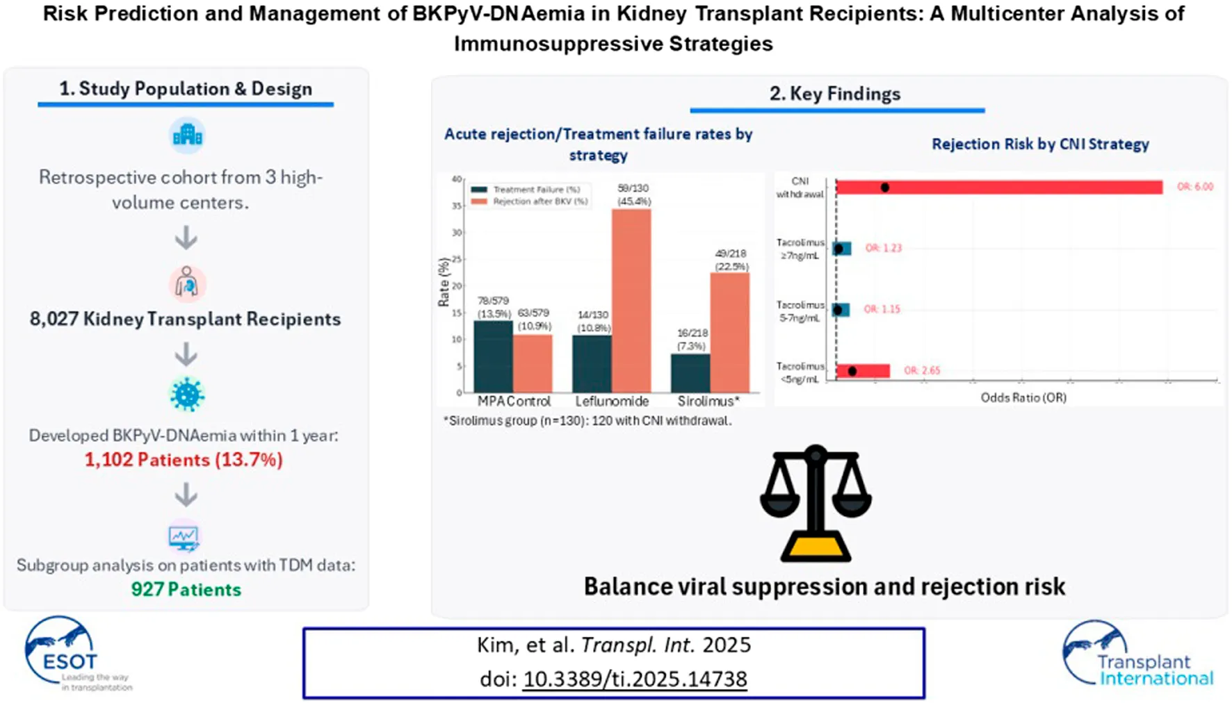Kim J-M, Kwon HE, Han A, Ko Y, Shin S, Kim YH, Lee KW, Park JB, Kwon H and Min S (2025) Risk Prediction and Management of BKPyV-DNAemia in Kidney Transplant Recipients: A Multicenter Analysis of Immunosuppressive Strategies. Transpl. Int. 38:14738. doi: 10.3389/ti.2025.14738