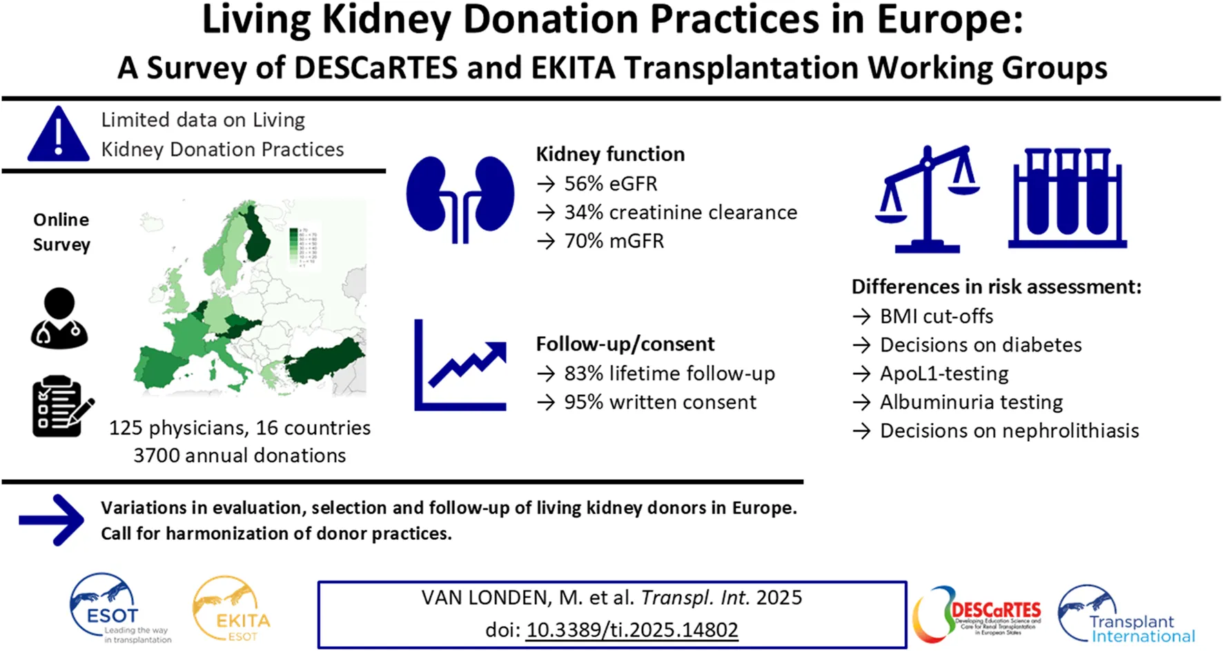 van Londen M, Gaillard F, Zaza G, Oniscu GC., Gandolfini I, Furian L, Stojanovic J, Cucchiari D, Hilbrands LB., Mjøen G and Mariat C (2025) Living Kidney Donation Practices in Europe: A Survey of DESCaRTES and EKITA Transplantation Working Groups. Transpl. Int. 38:14802. doi: 10.3389/ti.2025.14802