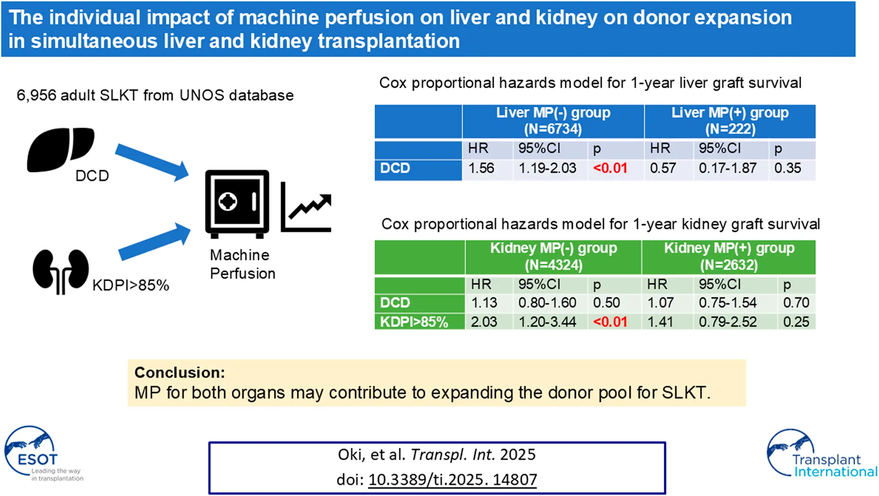 Oki R, Rocha I, Al-Juburi S, Rajendran L, Kerby E, Mohamed A, Al-Kurd A, Nassar A, Kim DY., Yoshida A, Abouljoud M and Nagai S (2025) The Individual Impact of Machine Perfusion on Liver and Kidney on Donor Expansion in Simultaneous Liver and Kidney Transplantation. Transpl. Int. 38:14807. doi: 10.3389/ti.2025.14807