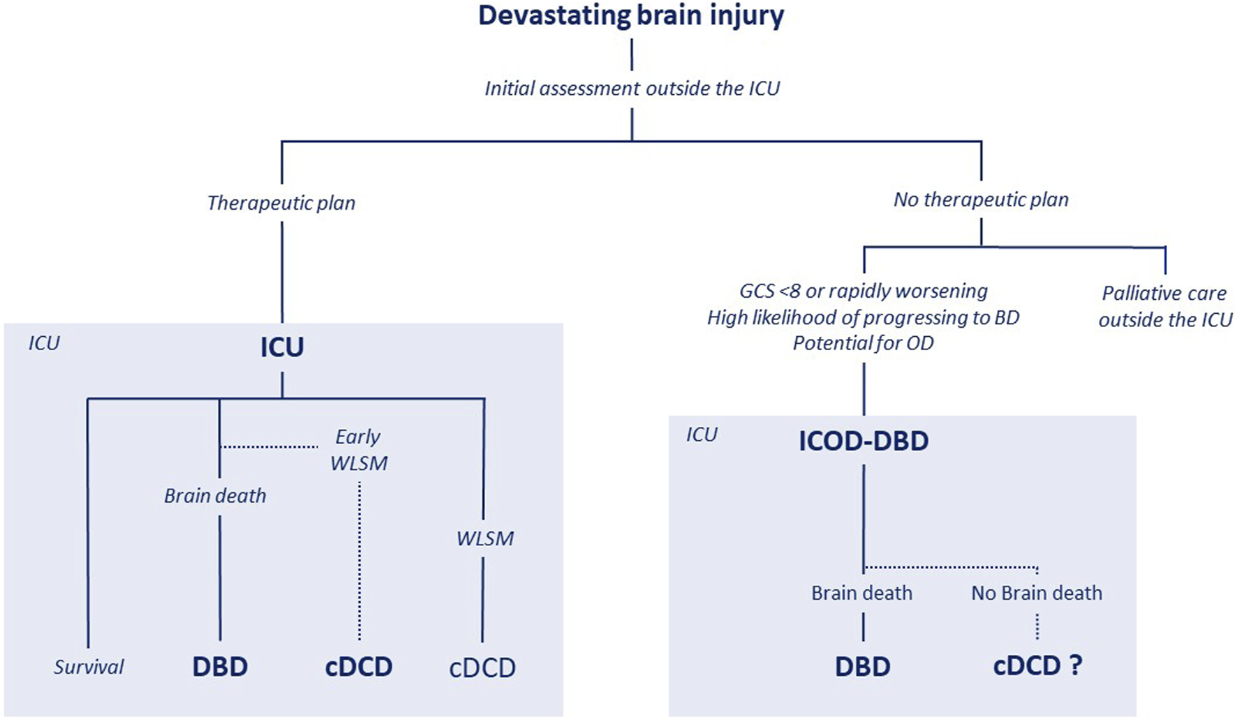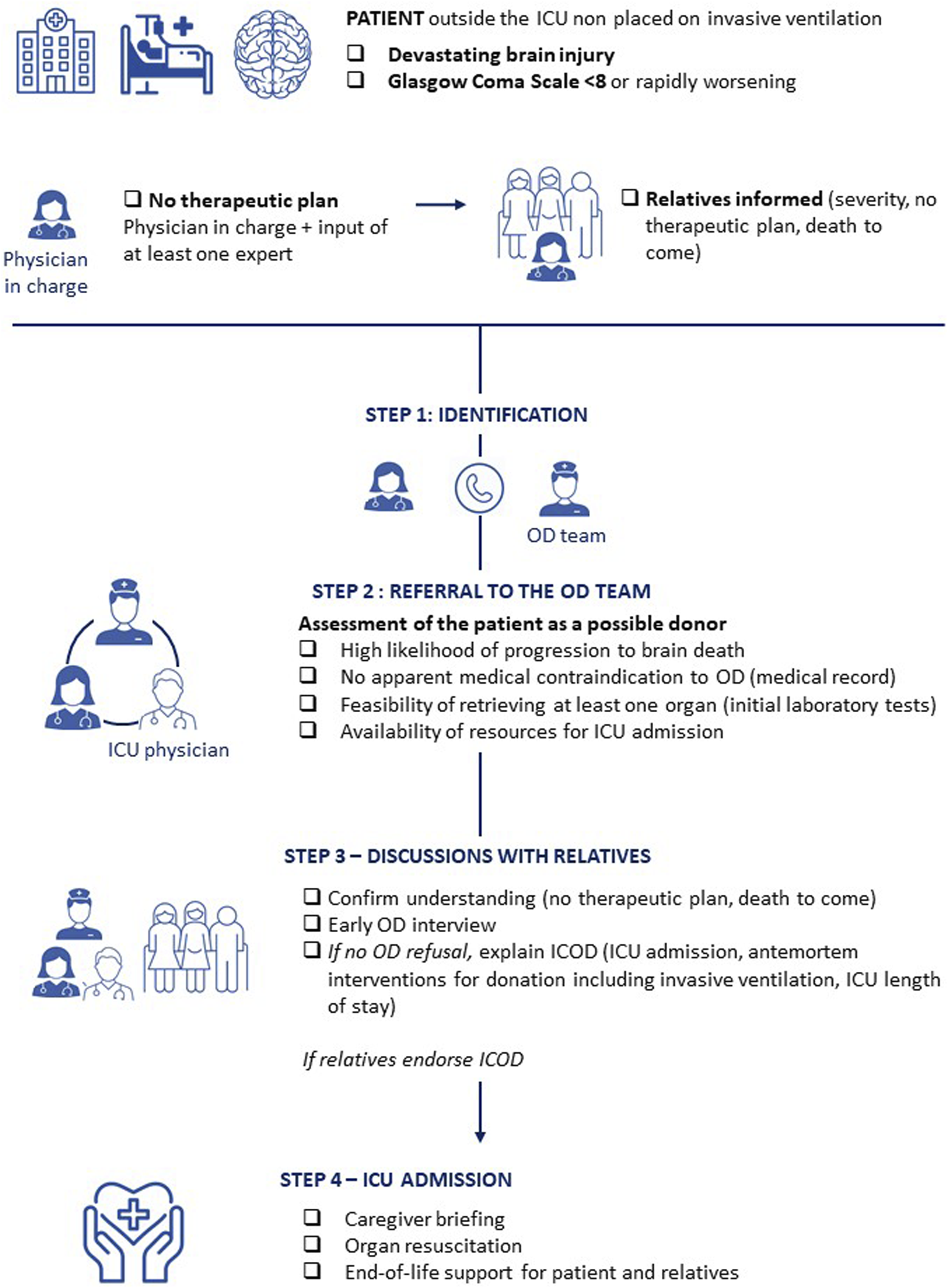 The French definition of ICOD differs slightly from the original Spanish definition in several important respects. In Spain, ICOD is understood to include both the initiation and continuation of intensive care for the purpose of OD. In contrast, the French guidelines specifically address the management of patients with devastating brain injury who are not yet in the ICU but rather in partner services (such as emergency departments or neurology units), who, in the vast majority of cases, are not intubated at the time of initial assessment, and for whom a decision has been made not to admit them to the ICU for a therapeutic plan. They do not include the referral of patients who have already been admitted to the ICU after having been placed on invasive ventilation by emergency teams, either outside or inside the hospital, and for whom the ICU team has decided - either at the time of the initial assessment or after several hours or days of treatment - that no therapeutic plan is possible, but that intensive care could nonetheless be initiated solely for the purpose of OD [20]. For these patients already admitted to the ICU, it is recommended to prioritize discussing OD after the BD diagnosis, while informing the family of the imminent (i.e., no early interview). An early mention of OD should only occur if the family specifically inquires about the continuation of intensive care.