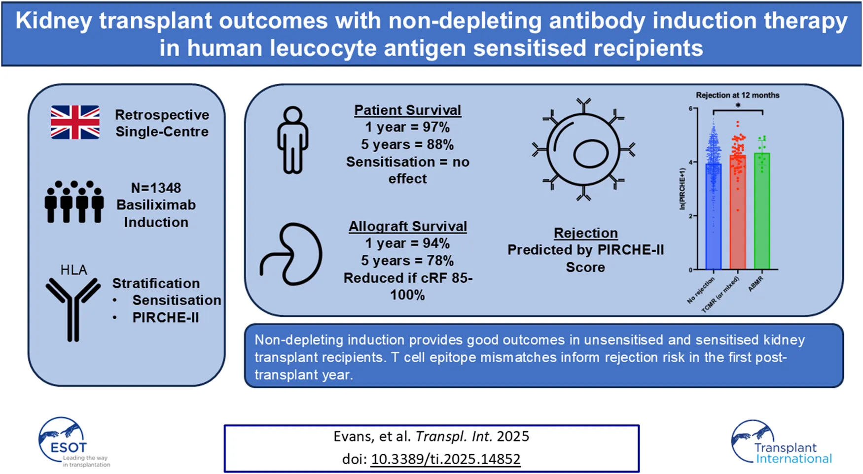 Nagpal R, Butler K, Thal N, Hobill A, Gage A, Javed M, Karst F, Khan AA, Needleman A, Shirling G, Stephens H, Vivers S, Tavarozzi F, Mayor N, Frater S, Salama A, Harber M, Jones G, Fernando R and Evans RD.R. (2025) Kidney Transplant Outcomes With Non-Depleting Antibody Induction Therapy in Human Leucocyte Antigen Sensitised Recipients. Transpl. Int. 38:14852. doi: 10.3389/ti.2025.14852