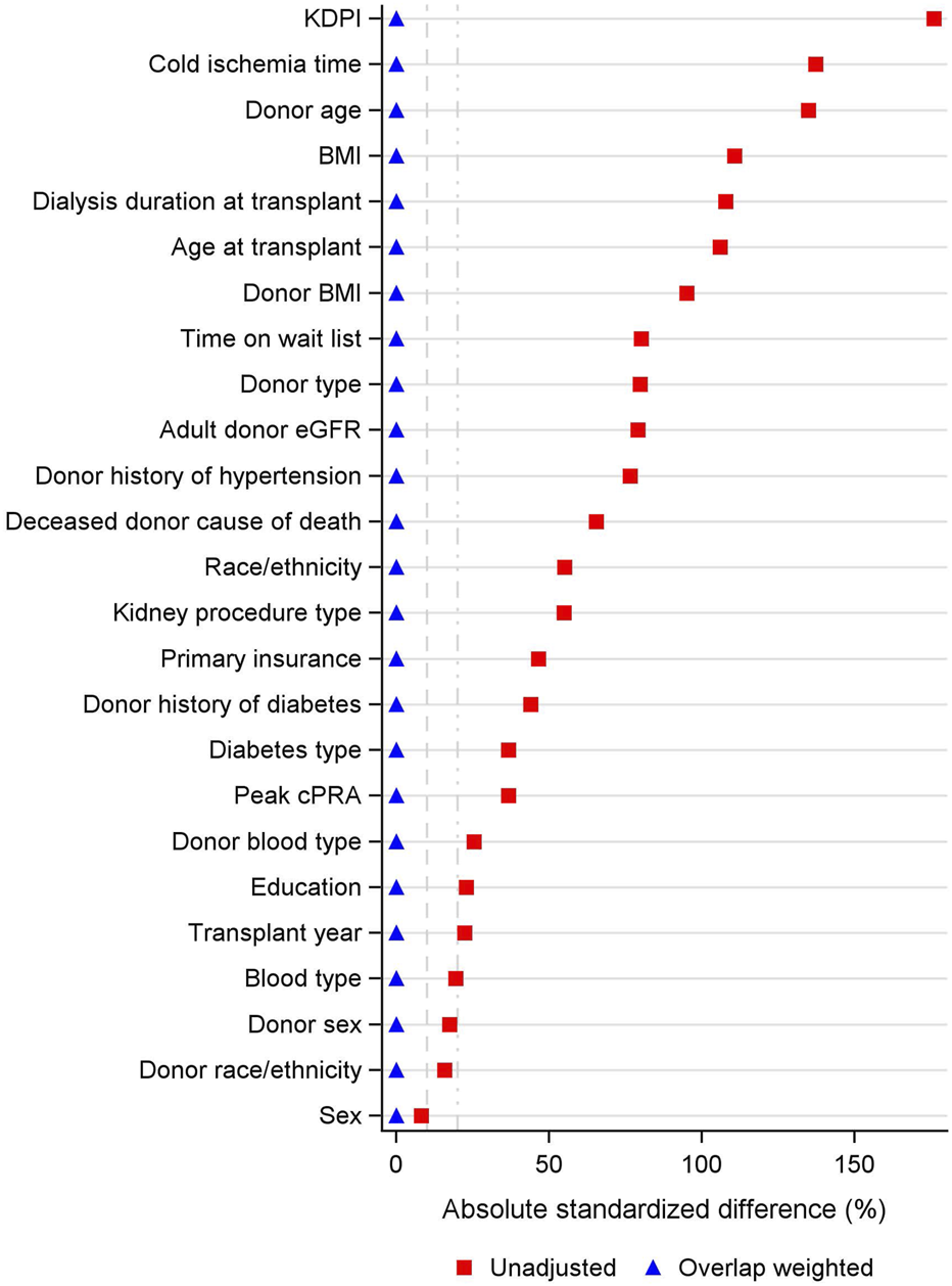 Data were missing for the following variables: education (1.4%), donor history of hypertension (1.2%), donor history of diabetes (1.1%), KDPI (0.74%), BMI (0.72%), donor eGFR (0.71%), cold ischemia time (0.49%), donor BMI (0.29%), dialysis duration at transplant (0.16%), peak cPRA (0.13%), pancreas procedure type (0.04%), donor race/ethnicity (0.02%), and primary insurance (0.009%).