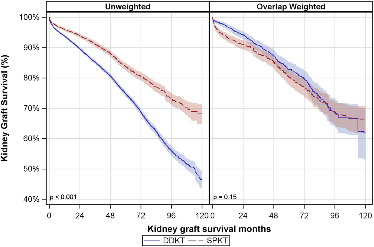 This study presents several limitations. Firstly, notable differences in recipient characteristics were observed, potentially introducing selection bias in the preference for DDKT over SPKT among candidates with higher surgical risks. The study’s retrospective nature allows for identifying correlations without establishing causality. Additionally, other recipient characteristics not available in the registry may have also impacted the study results. We employed propensity score weighting to mitigate potential confounding due to the notable differences in characteristics between DDKT and SPKT recipients. However, achieving covariate balance on the mean through overlap weighting may not ensure complete adjustment for confounding across all variables. While propensity score weighting reduces bias from measured covariates, it cannot address unmeasured confounders, which may still influence treatment assignment and outcomes, leaving the potential for residual confounding.