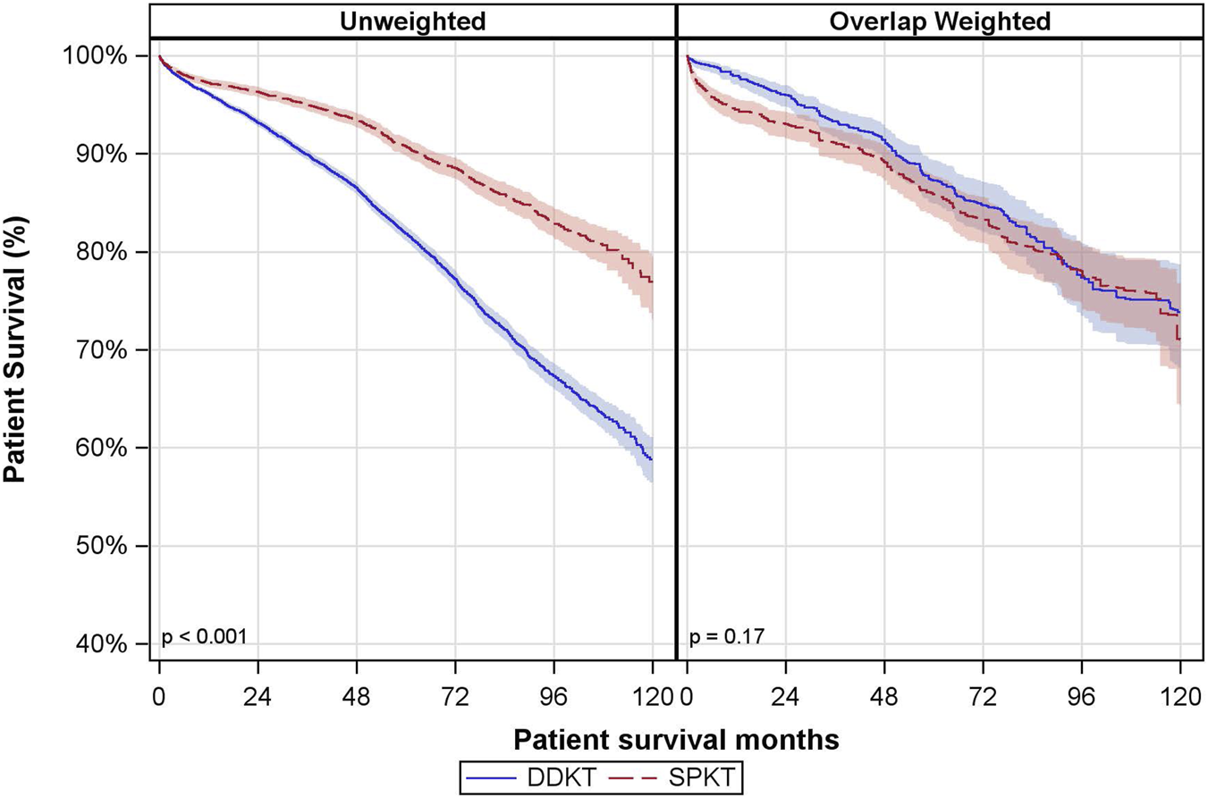 The comparative benefits of SPKT versus DDKT remain challenging to assess due to inherent differences in recipient selection practices, variability in donor organ quality, and the trade-offs between surgical and immunological risks versus potential metabolic improvements and quality-of-life gains from pancreas transplantation. Our study uniquely addresses these critical gaps by employing advanced overlap propensity score weighting techniques designed to mitigate selection bias across a broader recipient cohort with diabetes, rigorously evaluating multiple outcome measures beyond pancreas graft function alone and reflecting contemporary surgical practices and immunosuppression protocols. By precisely matching SPKT and DDKT recipients on critical donor and recipient characteristics, we provide a more accurate comparative assessment of the true benefits and risks associated with SPKT.
