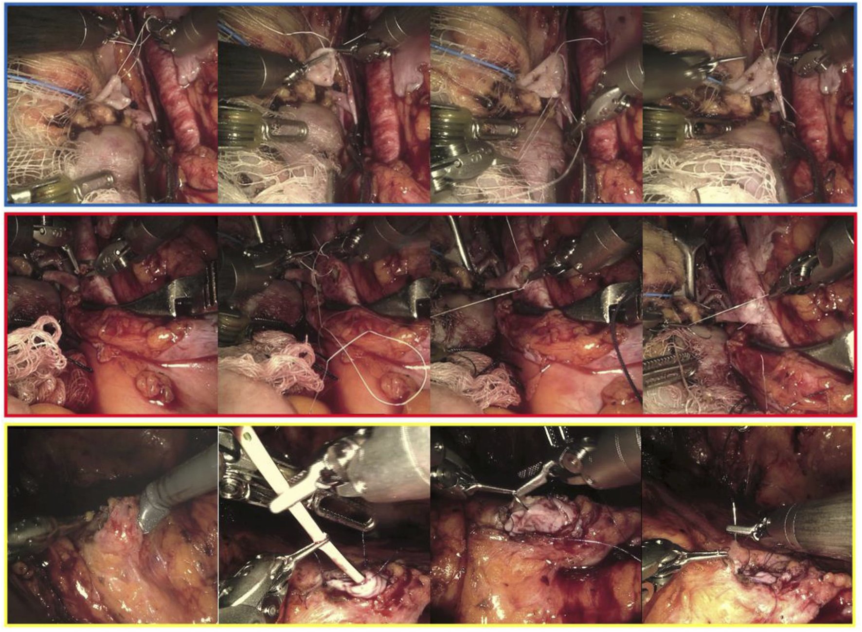 Intraoperative snapshots showing the main phases of the venous (framed in blue), arterial (red) and uretero-vesical anastomosis during living donor robotic-assisted kidney transplantation.