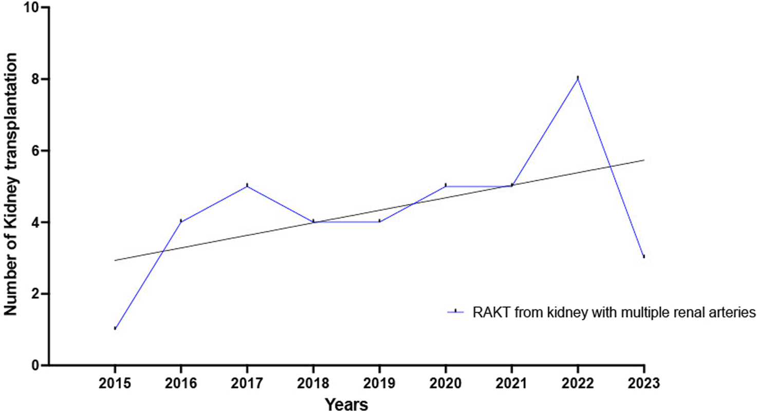 Yearly number of RAKT with multiple renal arteries increased from 2015 to 2023.