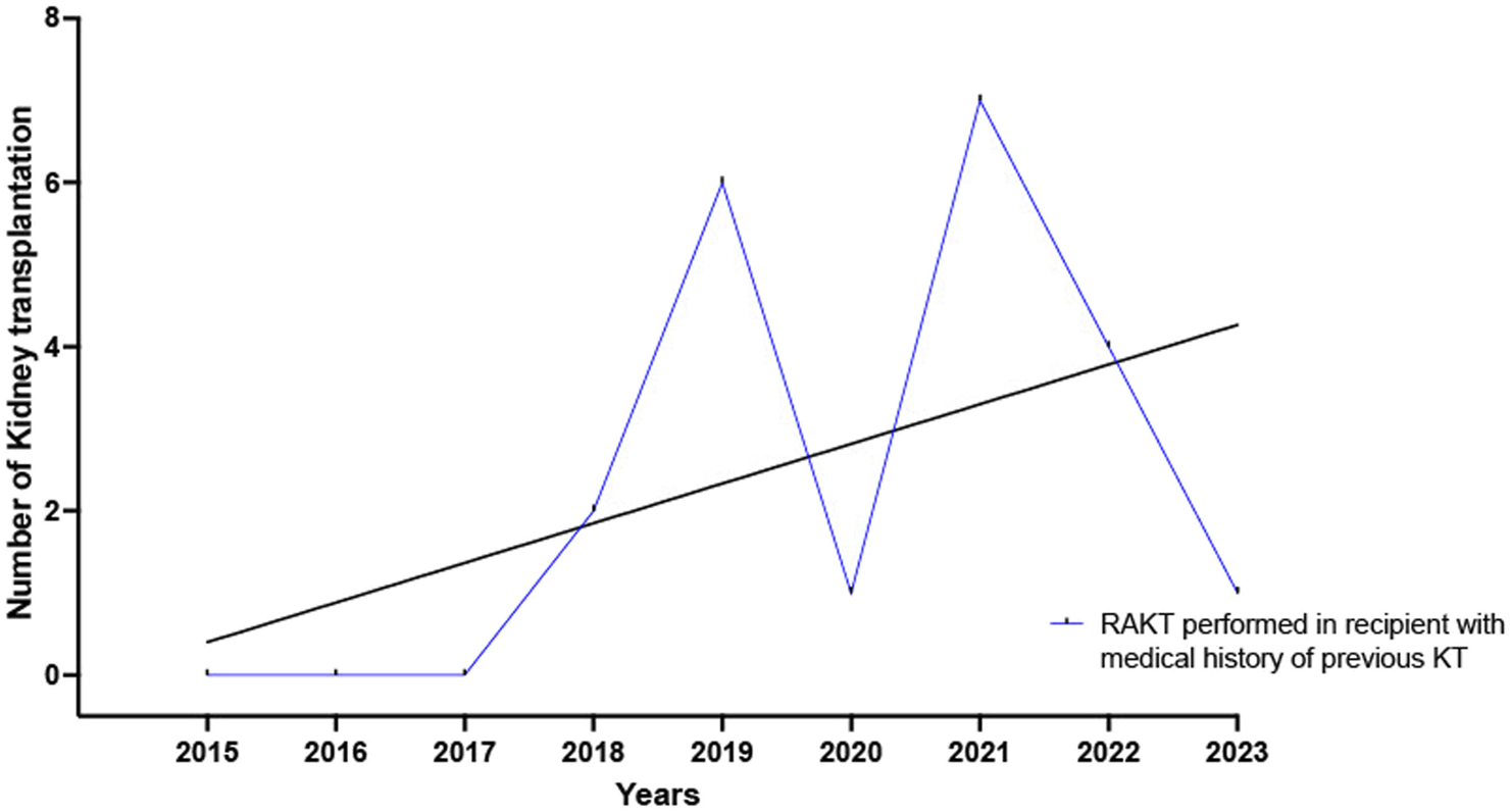 Yearly number of RAKT performed in recipients who undergone a previous kidney transplantation increased from 2015 to 2023.