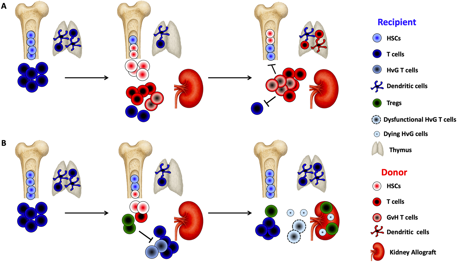 Chimerism-based transplant tolerance (A) Sustained Full Chimerism: Following non-myeloablative conditioning, recipients receive a large number of donor CD34+ hematopoietic stem cells (HSCs) and donor T cells along with the kidney allograft. Graft-versus-host (GvH) reactivity may promote the expansion of donor T cells, which eliminate recipient T cells and hematopoietic cells, thereby creating space in the bone marrow for donor HSCs to engraft. Once engrafted, donor HSCs continuously supply the thymus with T cell precursors and dendritic cell progenitors, promoting central donor-specific tolerance. These conditions support the establishment of sustained full chimerism. (B) Transient Mixed Chimerism: After non-myeloablative conditioning with T cell-depleting induction, recipients receive unfractionated donor bone marrow, including HSCs and T cells, alongside the kidney allograft. The conditioning regimen induces lymphopenia while sparing regulatory T cells (Tregs), leading to early Treg expansion. In the presence of donor antigen, this Treg-dominant environment suppresses the activation of host-versus-graft (HvG)-reactive T cells and fosters peripheral deletion of donor-reactive T cells. These mechanisms enable the development of transient mixed chimerism.