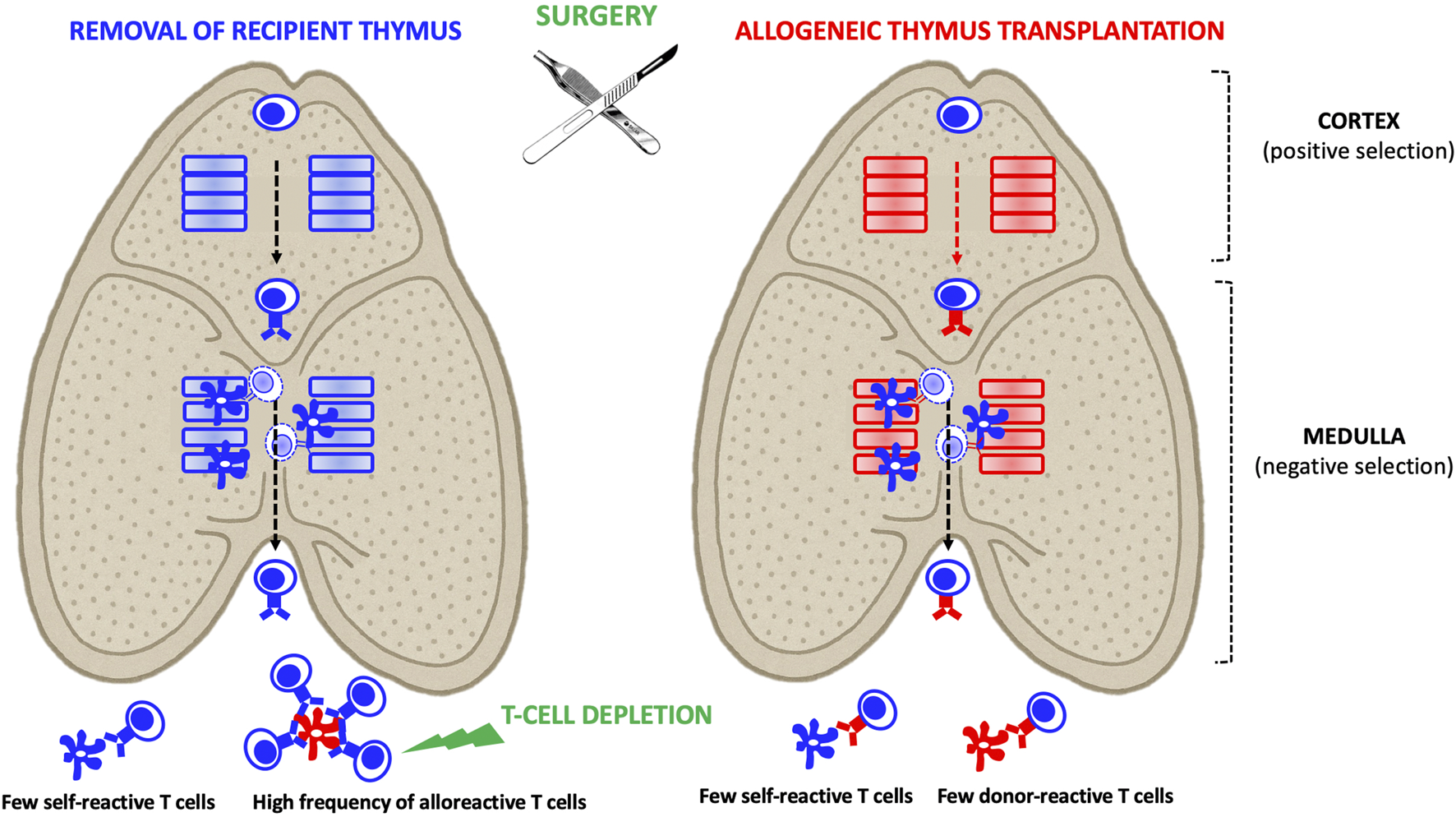 Allogeneic Thymus Transplantation: In the recipient thymus, thymocytes derived from T cell progenitors undergo positive selection by cortical epithelial cells. This positive selection process determines the T cells’ restriction to self-HLA antigens (depicted by a blue TCR) that were recognized in the cortex. Subsequently, developing thymocytes undergo negative selection in the medulla, where those that strongly react to self-antigens presented by medullary epithelial cells and dendritic cells are eliminated. As a result, mature thymocytes exiting the thymus are devoid of self-reactive T cells but may still include alloreactive T cells. In the context of allogeneic thymus transplantation, recipient-derived thymocytes are positively selected on donor HLA molecules (depicted by a red TCR). As they migrate through the medulla, they undergo negative selection, eliminating those that strongly react to recipient HLA (presented by medullary dendritic cells) or donor HLA (presented by medullary epithelial cells). Consequently, the mature thymocytes that exit the donor thymus are tolerant to both recipient and donor antigens. Combining thymus and organ transplantation from the same donor represents a potent strategy to induce immune tolerance. However, two key conditions must be met to achieve this: 1- The recipient’s native thymus must be removed to eliminate a source of donor-reactive T cells. 2- Pre-existing peripheral donor-reactive T cells generated before thymus transplantation must be eliminated.