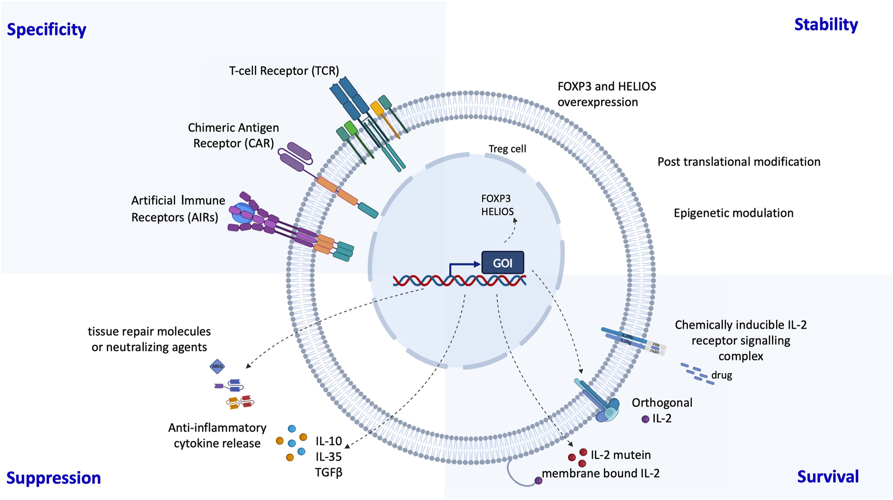 Possibilities to enhance Treg therapies through genetic engineering: Several groups have developed genetic engineering strategies to improve the specificity, stability, survival and suppression of regulatory T cells. Specificity has been greatly enhanced by the addition of chimeric antigen receptors (CARs) or synthetic T cell receptors (TCRs). Stability can be achieved by overexpression of the transcription factors FOXP3 and HELIOS and suppression can be supported by expression of anti-inflammatory cytokines and molecules. The in vivo survival of regulatory T cells can be prolonged by making them self-sufficient in a Treg specific IL-2.
