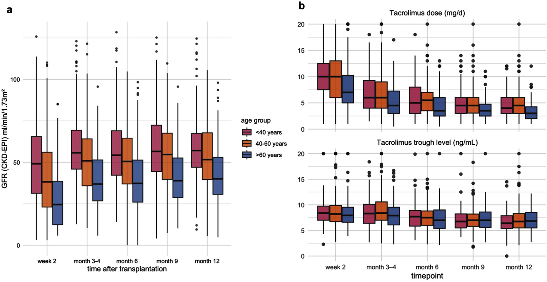 The incidence of delayed graft function (DGF) increased significantly with recipient age, rising from 22.4% in recipients <40Â years to 36.3% in those >60Â years (p = 0.012, Table 1). Across all age groups, there was a significant improvement in estimated glomerular filtration rate (eGFR) from month 1 to month 3, with the greatest relative increase observed in recipients >60 years (median +50.2% from the baseline median of 24.5Â mL/min/1.73Â m2). Younger recipients maintained higher absolute eGFR levels throughout the first year (Figure 3a). In recipients >60 years, lower tacrolimus doses were required to achieve comparable and adequate drug levels (Figure 3b).