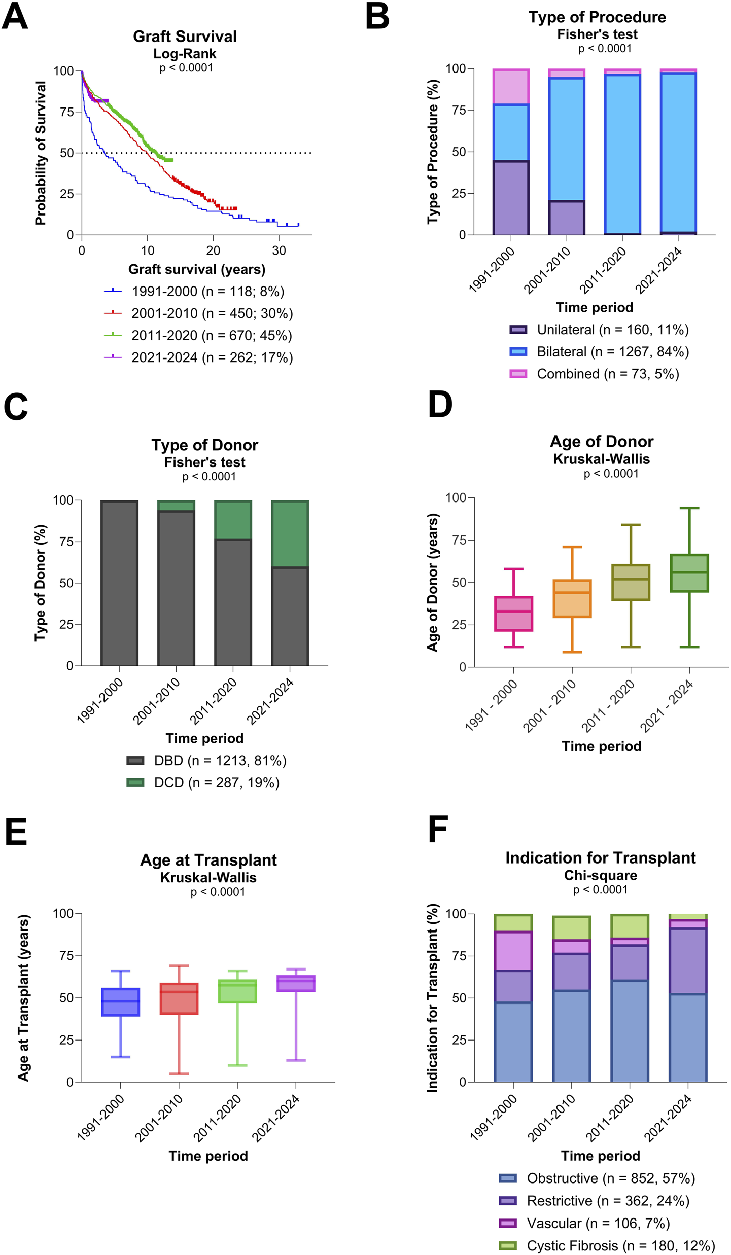 This retrospective, single-center study analyzed all 1,500 consecutive LuTx procedures performed at University Hospitals Leuven between July 1991 and December 12, 2024. Data collected included donor demographics (age and donation type) and recipient characteristics (age at LuTx, sex, transplant indication, date of transplant, procedure type, time to CLAD, CLAD phenotype, and graft survival), with follow-up censored on 31 December 2024. Patients were categorized by transplantation era (1991–2000, 2001–2010, 2011–2020, and 2021–2024) and by procedure type: unilateral LuTx (single LuTx), bilateral LuTx (sequential single LuTx), or combined LuTx (LuTx combined with heart, liver, and/or kidney transplantation). Transplant indications were grouped into four categories: obstructive, restrictive, vascular, and CF) (Supplementary Table S2) for outcome analyses. For patients transplanted since 2010, CLAD phenotyping was performed according to the 2019 ISHLT consensus [12], as earlier data were insufficient for detailed classification. Institutional Ethical Review Board approval was waived for this retrospective observational study (S51577/S63978).