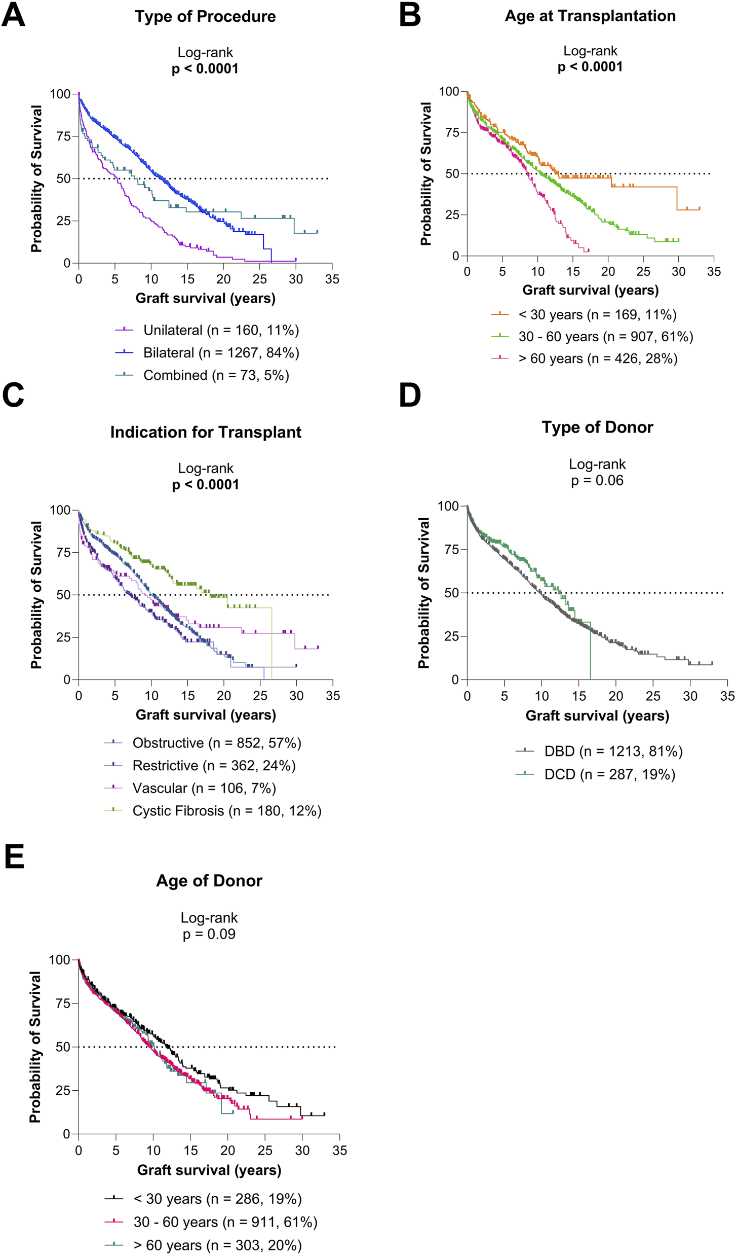 Graft survival according to type of procedure and donor/recipient characteristics (A) Graft survival for diverse types of procedures. (B) Graft survival for diverse recipient age groups. (C) Graft survival for diverse indications for transplantation. (D) Graft survival based on type of donor. (E) Graft survival based on age of donor.