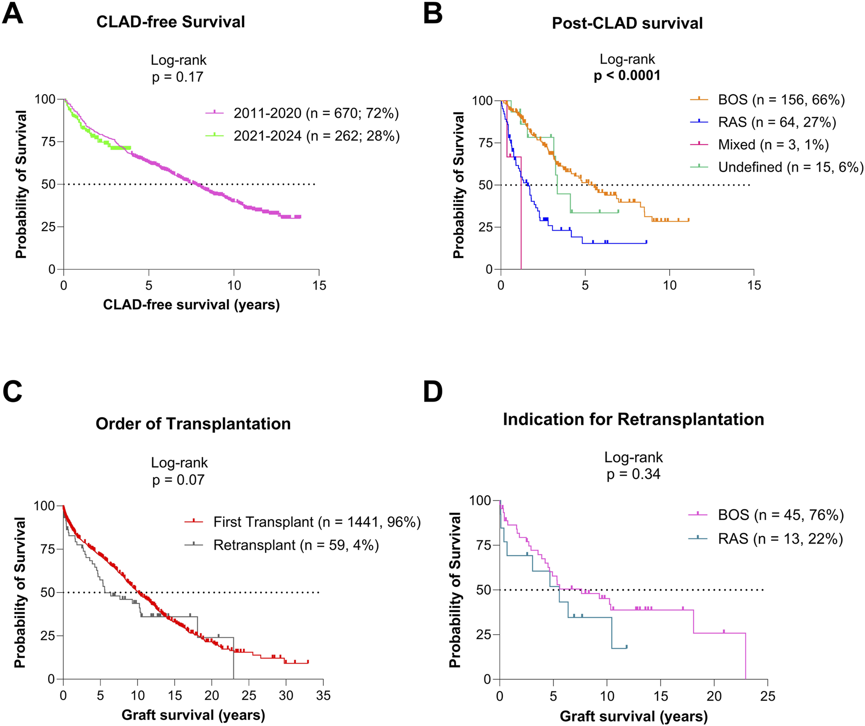Graft survival based on CLAD status (A) CLAD-free survival for the patients transplanted since 2011. (B) Post-CLAD survival for patients transplanted since 2011. (C) Graft survival for patients after primary transplantation and retransplantation. (D) Graft survival after retransplantation for BOS and RAS CLAD phenotypes.