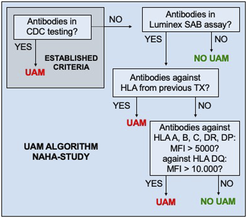 HLA were classified as UAM prior to KT if at least one of the predefined criteria (Figure 1) were met at any time. Once an HLA was classified as unacceptable, it remained listed as such, irrespective of subsequent reductions in antibody MFI, lack of antibody detection, or a negative result in CDC-testing. During patient recruitment, UAM could only be reported to ET on the serological level.
