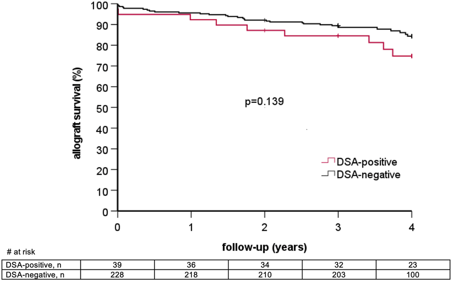 Patients were categorized as DSA-positive if they had HLA antibodies against donor HLA in the most recent Luminex SAB assay prior to transplantation. Assignment of donor-specificity was performed on the serological level based on the available donor HLA typing. In cases of DSA against self-HLA, high-resolution typing of both donor and recipient was performed retrospectively (n = 4). This approach revealed true donor-specificity in 1/4 cases. All other cases were counted as DSA-negative. Missing HLA typing was retrospectively performed in case of potential DSA. With this approach, patient categorization into DSA-positive or DSA-negative was possible in all patients with detectable anti-HLA antibodies. DSA were considered positive with MFI ≥1000 in the most recent SAB assay prior to KT.