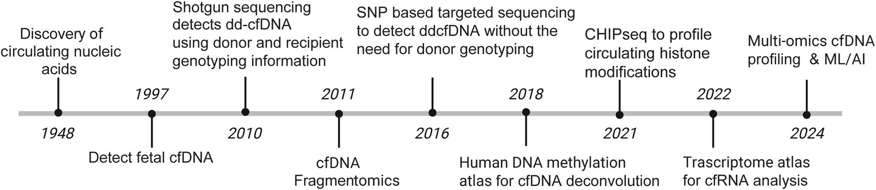Transplantation restores organ function and creates a donor–recipient genomic admixture wherein measurement of cell-free DNA (cfDNA) provides a noninvasive window into allograft health. Half a century after the discovery of cfDNA in human plasma, Denis Lo first reported on the presence of fetal DNA in maternal plasma in 1997 [13]. Despite these initial findings, cfDNA adoption in transplantation was initially slow. In 2010, Dr. Stephen Quake published a SNP-based approach that leveraged the unique transplant genomic admixture [14]. This 1st generation assay genotyped transplant donors and recipients to identify informative donor-recipient single nucleotide polymorphisms (SNPs). Post-transplant plasma was then subjected to cfDNA isolation and whole genome sequencing and reads were analyzed using SNPs to assign donor and recipient cfDNA fragments. Percent dd-cfDNA (%dd-cfDNA) was then computed as the donor-to-total (donor plus recipient) cfDNA percentage, which has become the standard reported value in transplant populations. Since then, commercial %dd-cfDNA tests are increasingly available for routine clinical care. These SNP-based assays used a targeted approach and imputed donor and recipient SNPs without the need for genotype data. Figure 1 summarizes the modern evolution of cfDNA technologies.