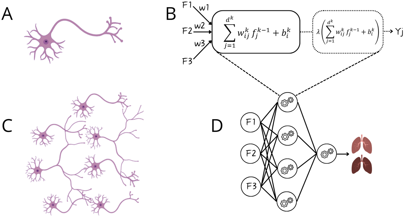Visualization of Underfitting, Optimal Fitting, and Overfitting in Regression and Classification. The top row illustrates regression settings, where the Outcome axis represents a continuous clinical measure (e.g., survival probability, biomarker level), and F1 represents a predictive feature. Every depicted lung represents a sample (e.g., patient). Underfitting occurs when the model is too simple to capture the true nonlinear relationship, whereas overfitting occurs when the model follows noise instead of the underlying trend. The optimal fit captures the true pattern without modeling random fluctuations. The bottom row shows these concepts in classification, where F1 and F2 represent two predictive features, and each lung corresponds to an individual patient belonging to one of two outcome classes (e.g., favorable vs. poor outcome). The model’s decision boundary is shown as a dotted line. A linear boundary underfits when classes are not linearly separable. An overly complex boundary overfits by tailoring itself to noise and outliers. The optimal fit provides a smooth, generalizable separation between classes.