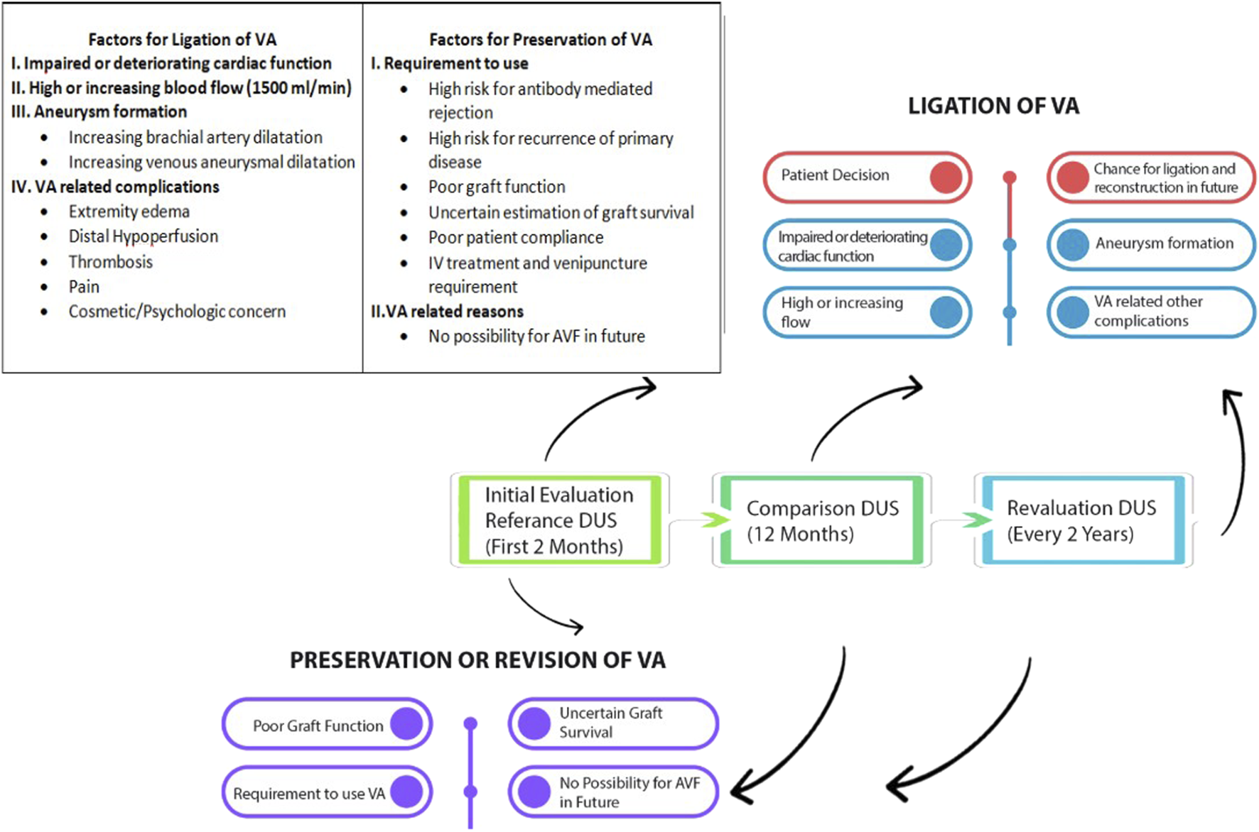 Graphic illustration of the proposed follow-up and management of arteriovenous vascular access after KT.