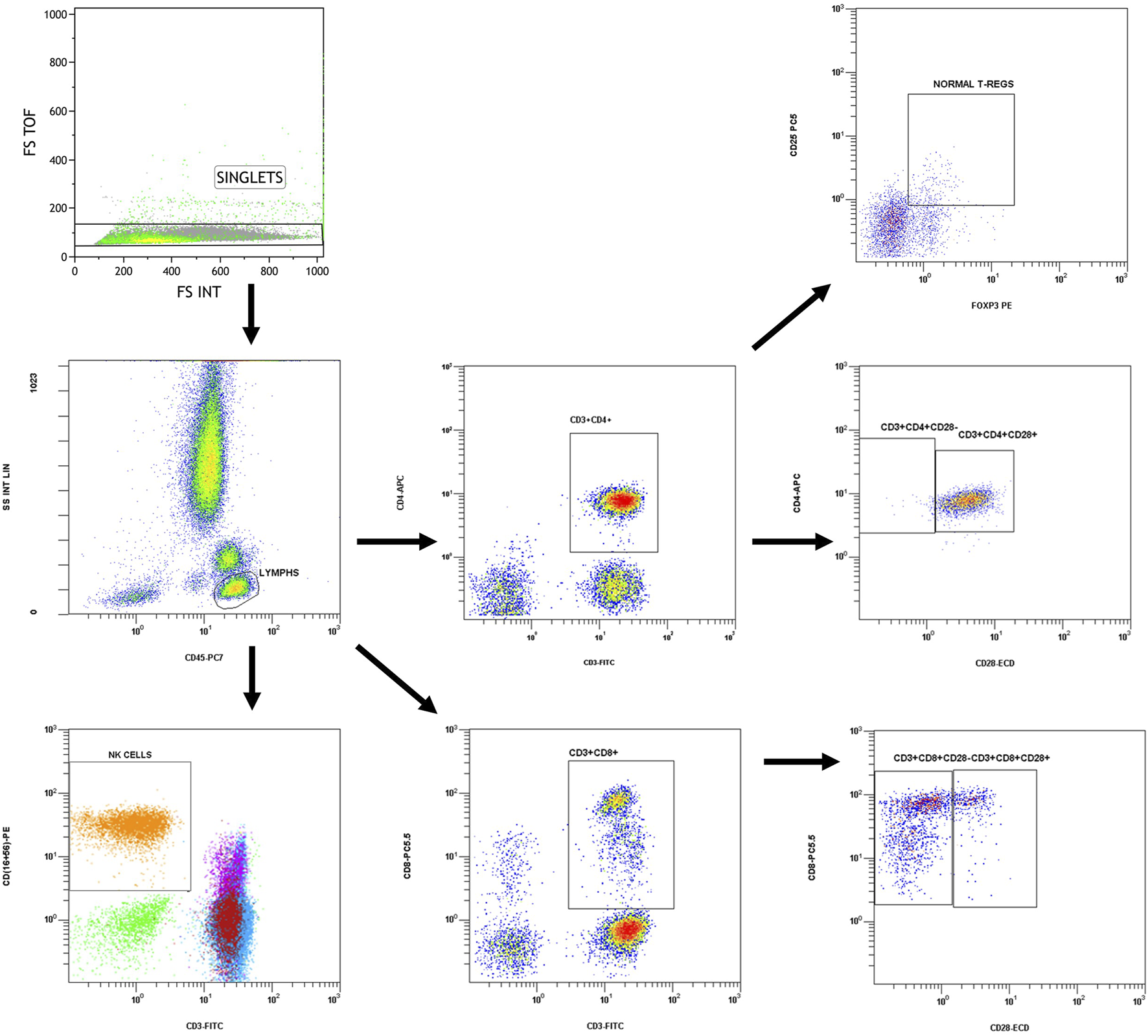 Immune phenotype examination was performed with flow cytometry on whole blood samples collected in K2EDTA tubes, within a short period after collection and in any case in no more than 12 h. Analysis was performed on a Navios EX Flow Cytometer (Beckman Coulter), according to the manufacturer’s instructions, using the following conjugated antibodies: CD45 PC7 (Clone J33), CD3 FITC (Clone UCHT1), CD16-CD56 PE [CD16: Clone 3G8, CD56: Clone N901(NKH-1)], CD4 APC (Clone 13B8.2), CD8 PC5.5 (Clone B9.11), CD4 FITC (Clone SFCI12T4D11), CD25 PC5 (Clone B1.49.9), and FOXP3 PE (Clone 259D, intracellular staining). Percentages of CD4+ (CD3+CD4+), CD8+ (CD3+CD8+), regulatory (CD4+CD25+FOXP3+) T lymphocytes as well as NK cells (CD3−CD16+CD56+) and CD28− (CD4+CD28− and CD8+CD8−) T cells were determined. The total lymphocyte count was also determined from a blood count in the same sample. Gating strategy is shown in Figure 1 and was manually adjusted in each case.