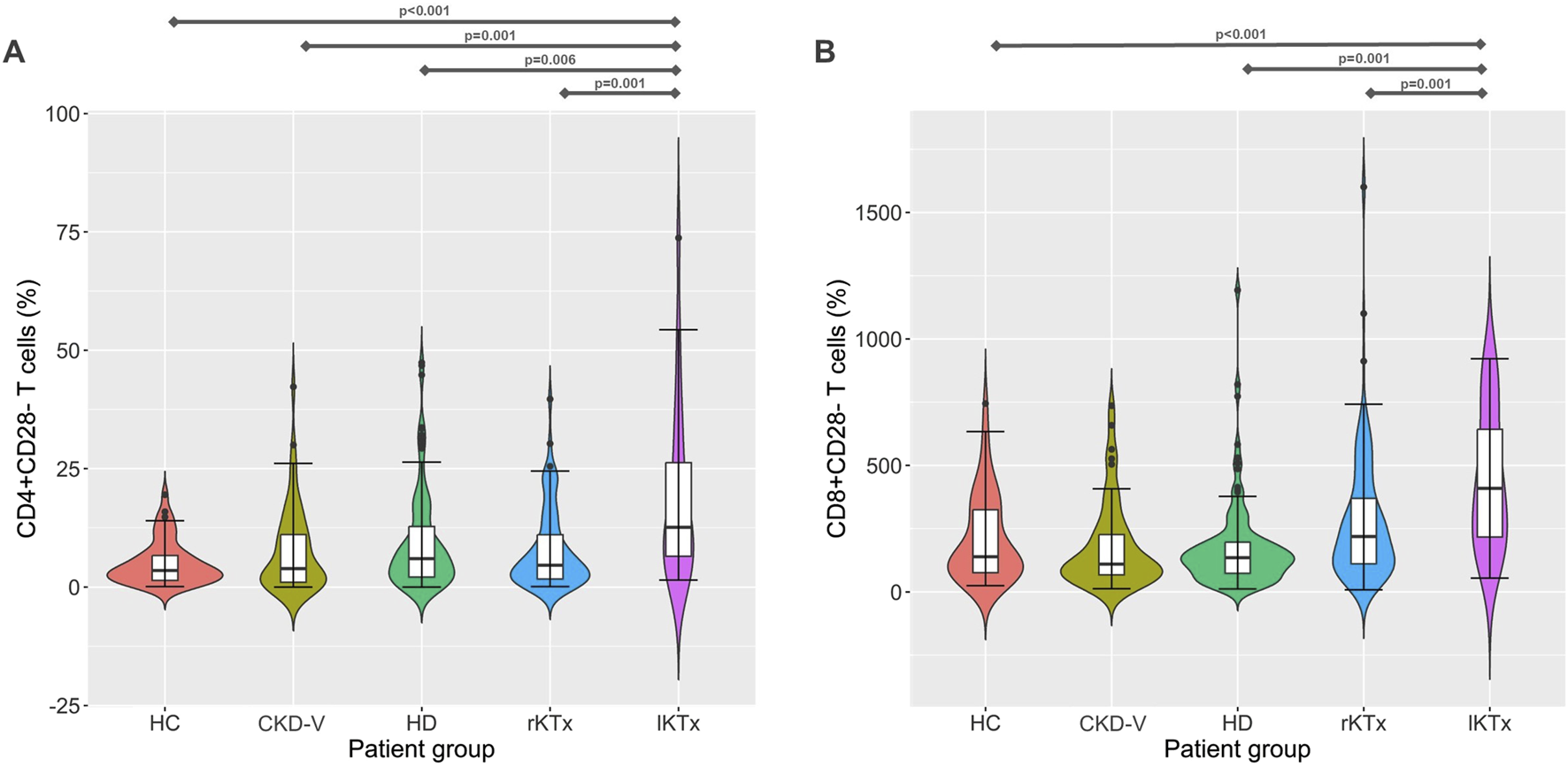 (A) CD4+CD28− and (B) CD8+CD28− T cell proportion kinetics in different CKD stages. CG: control group, CKD-V: chronic kidney disease stage V, HD: hemodialysis, rKTx: recent kidney transplantation, lKTx: long-term kidney transplantation. The arrows indicate groups with statistically significant differences between the examined parameters, after Bonferronni correction.