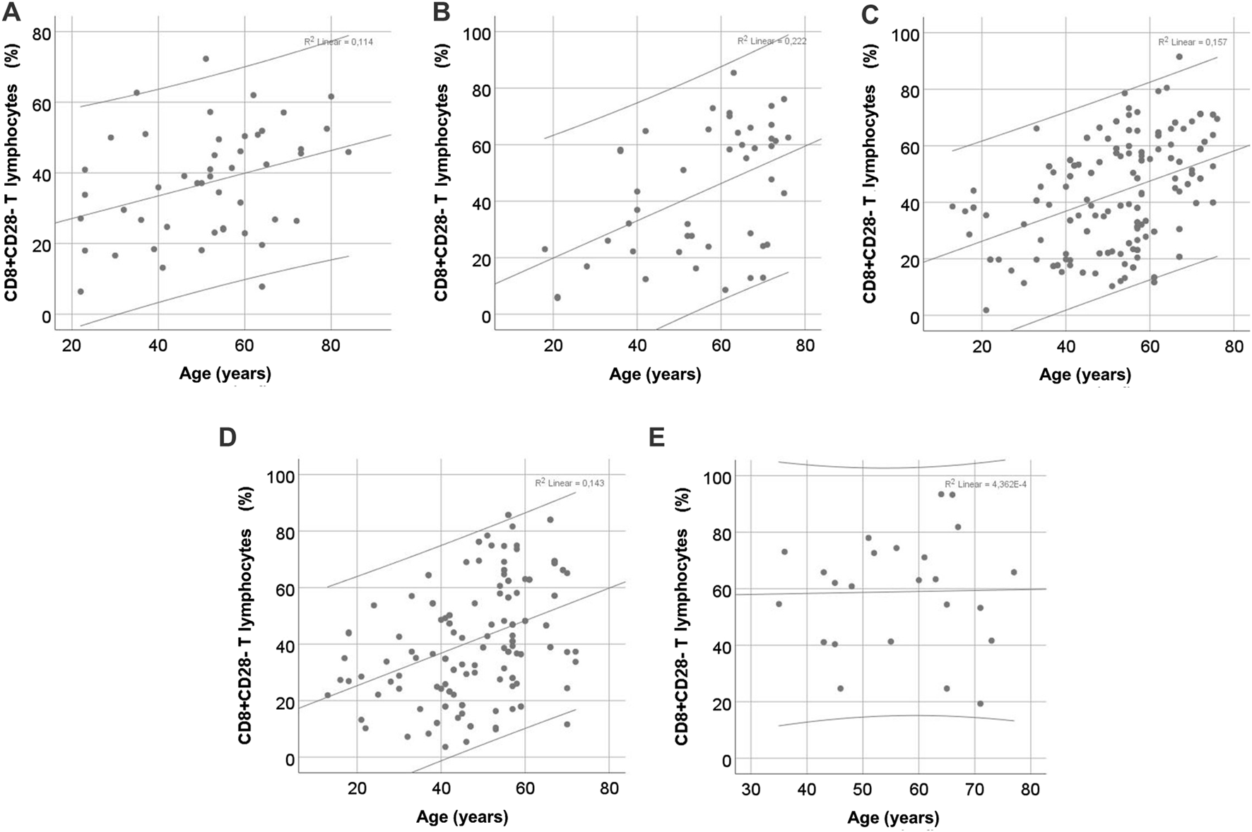 Correlation of CD8+CD28− T cell proportion with age in different CKD stages. (A) control group, (B) chronic kidney disease stage V, (C) hemodialysis, (D) recent kidney transplantation, (E) long-term kidney transplantation.