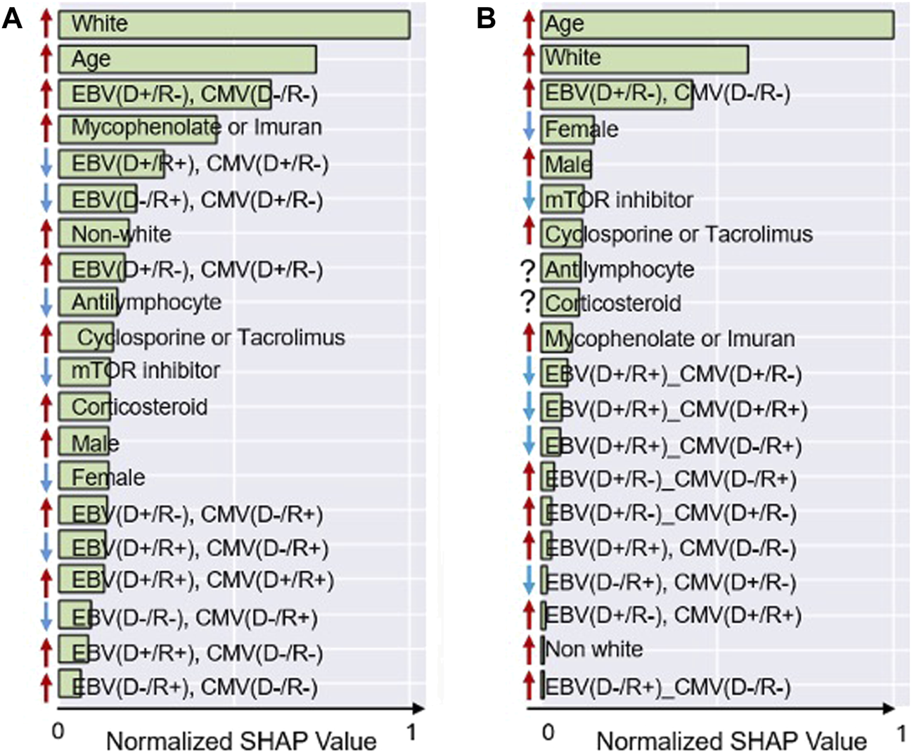 SHAP Analysis, impact of the features on model output. (A) Logistic regression. (B) Random forest. This figure illustrates the variable importance for the top 20 variables and the association with PTLD. Higher average SHAP values indicate a greater contribution of the variable to the model. The arrows indicate the direction of the association: red arrows represent positive associations, while blue arrows represent negative associations.
