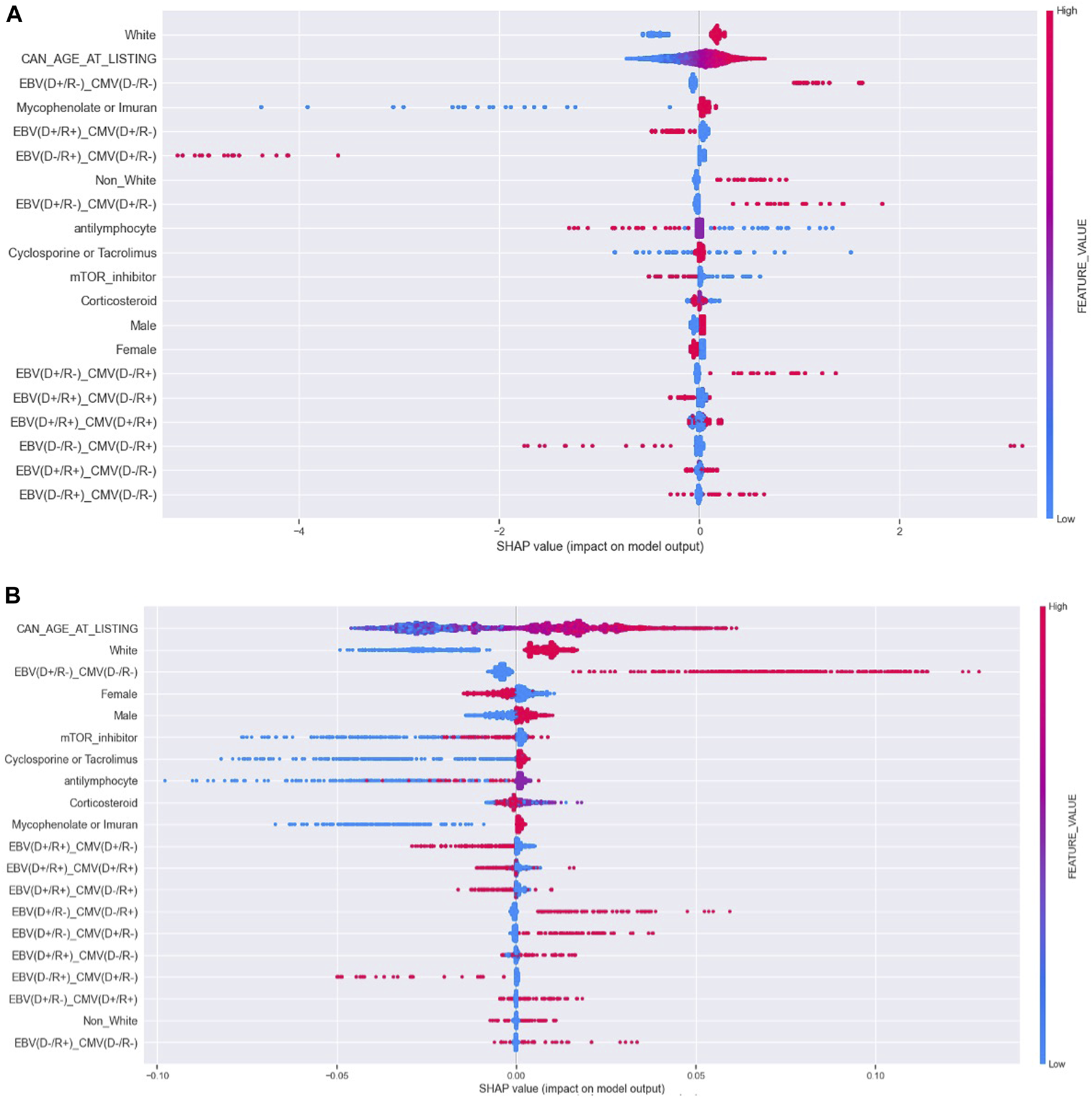 Figure 1 presents the SHAP rankings of the variables used in each model, highlighting the top 20 predictors of PTLD. In both models, age, white race, and combined serostatus—specifically [EBV (D+/R-), CMV (D-/R-)]—consistently emerged as the most influential predictors. The variables incorporated into the two machine learning algorithms are presented in Supplementary Table 3. The rankings of other predictors varied between the LR and RFC models. Male sex and the use of immunosuppressive agents such as mycophenolate compounds, azathioprine, cyclosporine or tacrolimus were associated with PTLD development, while treatment with mTOR inhibitors showed an inverse relationship. Figure 2 provides Bees worm plots of the shapely valued for the LR and RFC analyses.