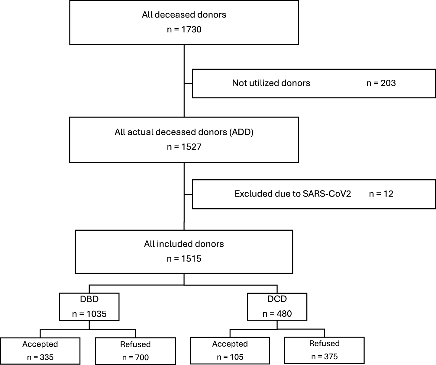 An overview of the analyzed cases, detailing donor types and exclusion criteria, is presented in Figure 1.