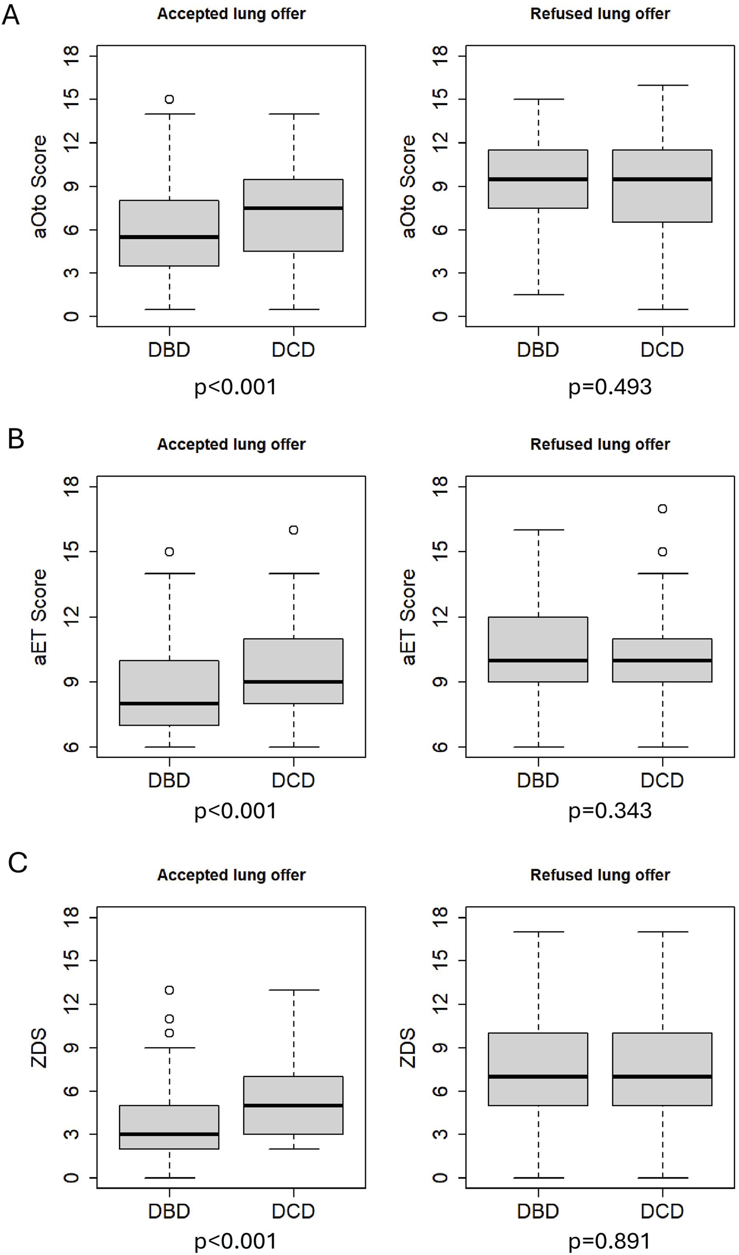 This study aims to assess how the ZDS and adapted versions of the Oto and ET Scores are associated with lung acceptance practices in Switzerland. Given the increasing number of DCD donations in recent years, it is of particular interest to calculate scores separately for DBD and DCD to evaluate whether they exhibit different probabilities for transplantation.