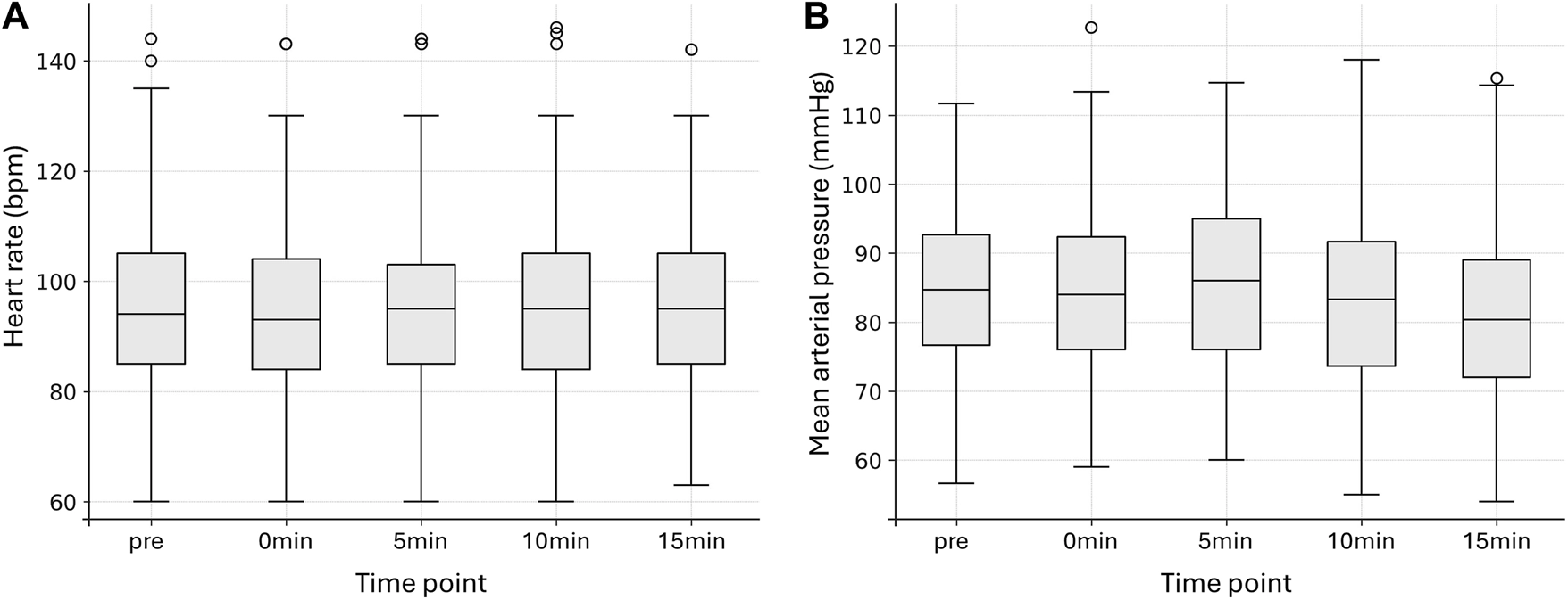 All statistical analyses were performed using SPSS (IBM, Version 31). Additional verification of results and figure generation were conducted in Python (version 3.11). Normality of all continuous variables was assessed using the Shapiro–Wilk test. Data following a normal distribution were expressed as mean ± SD, and non-normally distributed data as median [IQR, 25th-75th percentile]. Within-subject comparisons of continuous variables across time points were conducted using repeated-measures ANOVA for normally distributed variables or Friedman test for non-normally distributed data. Post-hoc pairwise comparisons were performed using paired T-tests or Wilcoxon signed-rank tests, respectively. Between-group comparisons were analyzed using Mann–Whitney U tests for both absolute values and relative changes from baseline (baseline = pre, Δ values). To increase group sizes and reduce the number of necessary comparisons, the end-tidal concentrations of desflurane and isoflurane, which were used in only a few cases, were converted into equipotent sevoflurane concentrations [26]. Associations between continuous variables were assessed using Spearman rank correlation for both absolute and Δ values. To evaluate potential additive or interaction effects of volatile anesthetics and opioids on HR and MAP, a two-way analysis of variance was performed with both agents as factors and a nonparametric aligned-rank transform ANOVA was applied. Both absolute values and Δ values were analyzed at each time point. To account for potential confounding by catecholamine administration, time-matched partial Spearman correlations were computed, evaluating the relationship of catecholamine infusion rate and hemodynamic parameters while controlling for opioid dose and volatile anesthetics concentration, and vice versa. All variables were rank-transformed before partial correlation, and residuals after regression on covariates were correlated to yield partial Spearman’s ρ. All tests were two-tailed. To control for multiple testing, Bonferroni correction was applied, and a corrected p ≤ 0.05 was considered statistically significant. The detailed description and results of all subsequent statistical analyses are provided in the Supplementary Material.