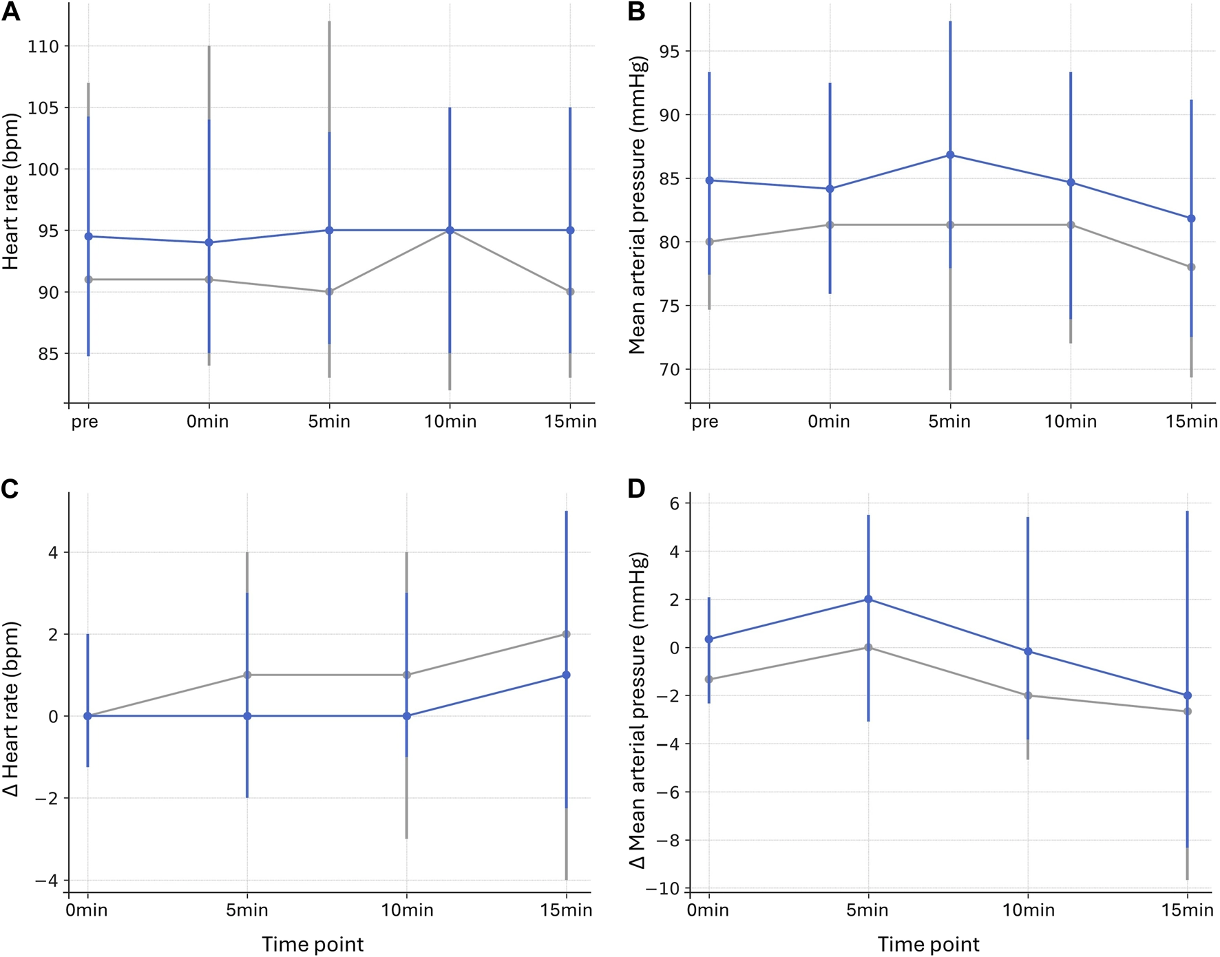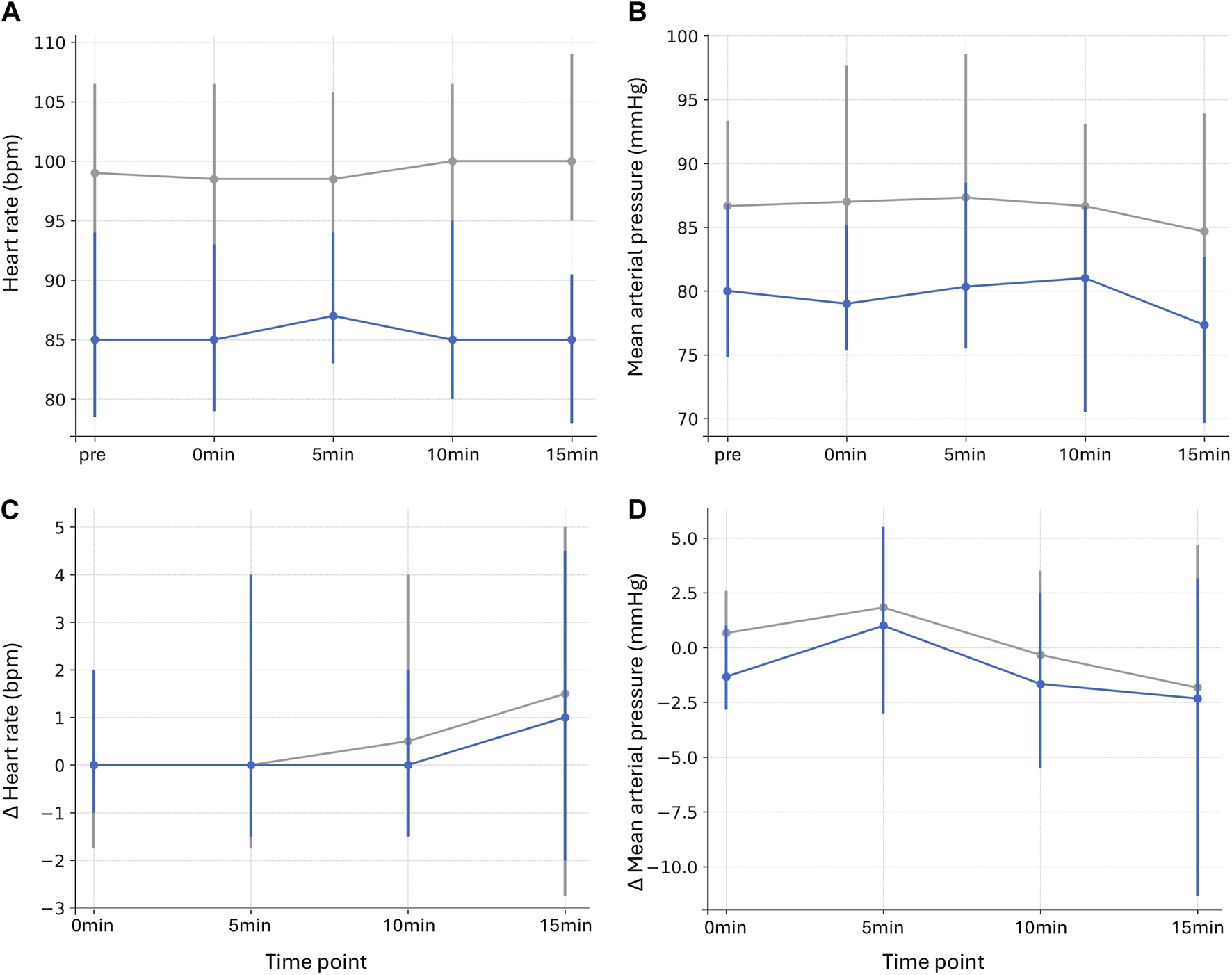 Absolute HR values were significantly lower in the sevoflurane group at all time points (p ≤ 0.001 for all, r = 0.470–0.571). Absolute MAP values were likewise reduced, but only significantly at 0 min (p = 0.020, r = 0.386), and with trends at pre (p = 0.093, r = 0.302), 5 min (p = 0.114, r = 0.292), 10 min (p = 0.075, r = 0.312), and 15 min (p = 0.057, r = 0.325), respectively (Figures 3A,B; Supplementary Table S4). No significant changes were observed for Δ HR (p = 1.000 for all, r = −0.114 to 0.048) or Δ MAP (p ≥ 0.193 for all, r = 0.030–0.253) at any time point (Figures 3C,D; Supplementary Table S4).