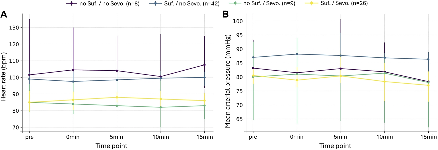 In contrast, sevoflurane administration was associated with consistently lower HR and MAP.