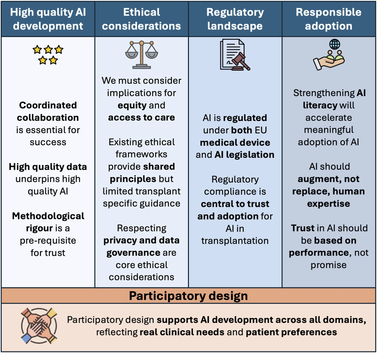To structure the recommendations and position statements, five domains were chosen reflecting the key requirements and challenges relevant to AI in transplantation: high-quality AI development and validation, ethical considerations, the regulatory landscape, responsible adoption, and participatory design (Figure 1).