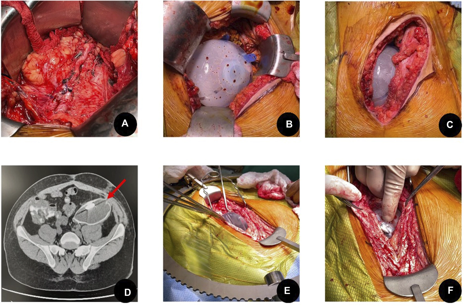 At the time of living-donor transplantation, the expander was encountered within a well-formed pseudocapsule. Extraction was straightforward, and the capsule provided a smooth-walled cavity corresponding to the prior graft bed (Figures 1D-F). Notably, the external iliac vessels and bladder were situated outside the borders of the expander and pseudocapsule, necessitating careful posterior dissection through residual scar tissue to obtain access to the vasculature and bladder. The donor kidney was anastomosed to the external iliac vessels in standard fashion. Immediate graft perfusion and urine output were observed following clamp release. The ureteroneocystostomy was completed over a stent without complication. The patient demonstrated immediate graft function and was discharged on postoperative day seven with stable renal function.